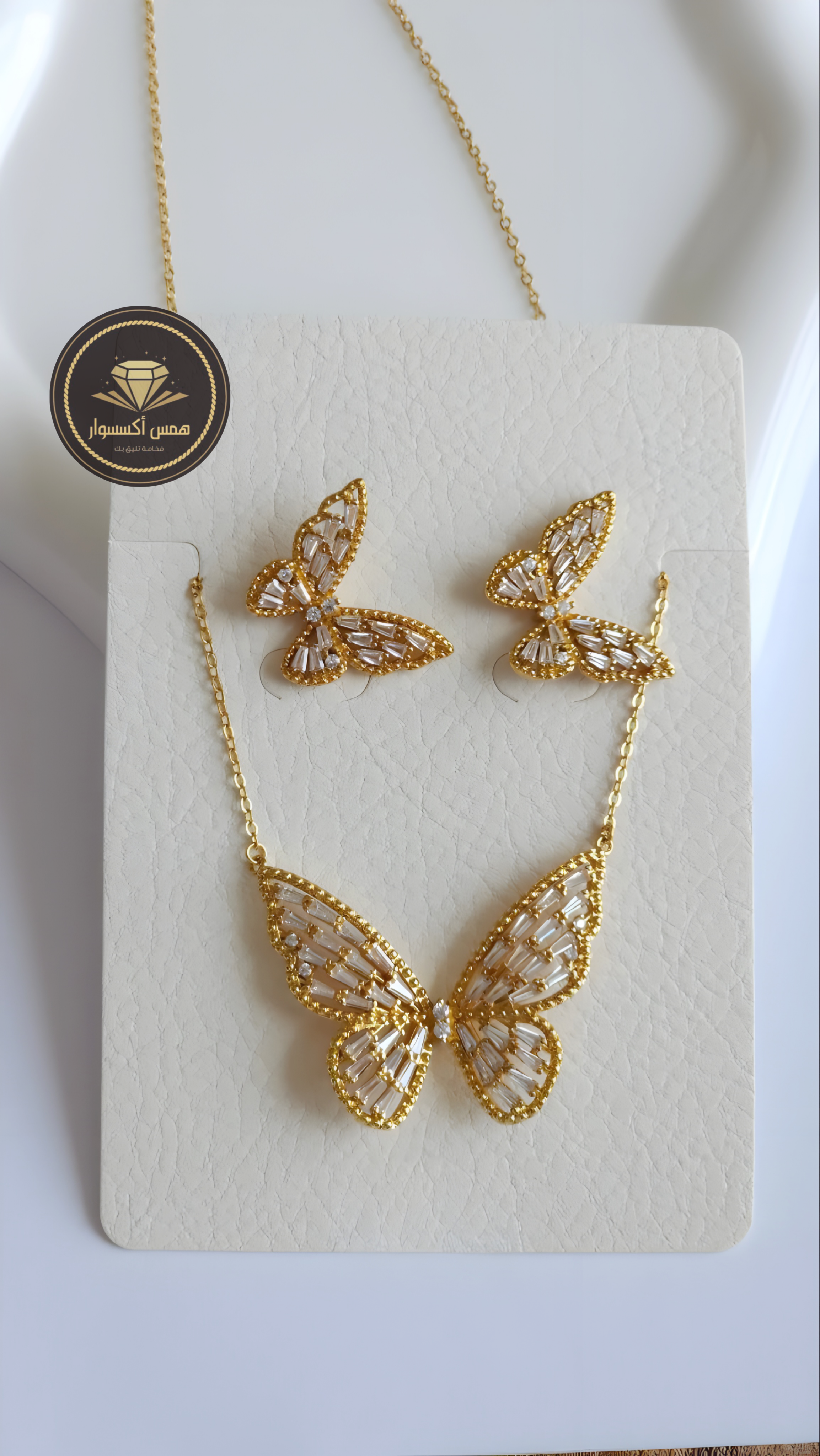 قلادة وحلق فراشة مميز ذهبي مرصع بلألماس
