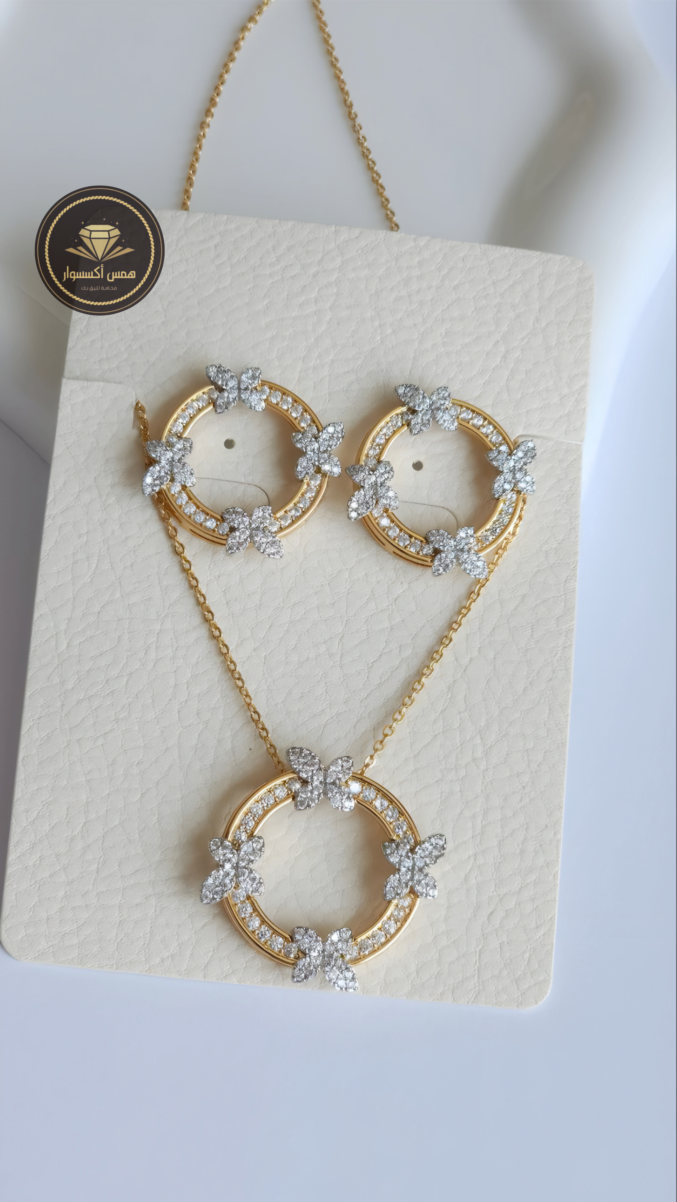 قلادة وحلق فراشة مميز ذهبي مرصع بلألماس